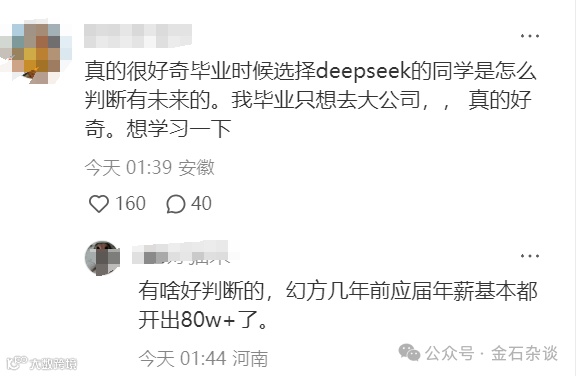 也有网友吐槽:真的很好奇毕业时候选择deepseek的同学是怎么判断有未来的。我毕业只想去大公司,真的好奇,想学习一下;甚至有不少同学留言:这是一家小作坊!下面有同学留言:有啥好判断的,幻方几年前应届年薪基本都开出80w+了。