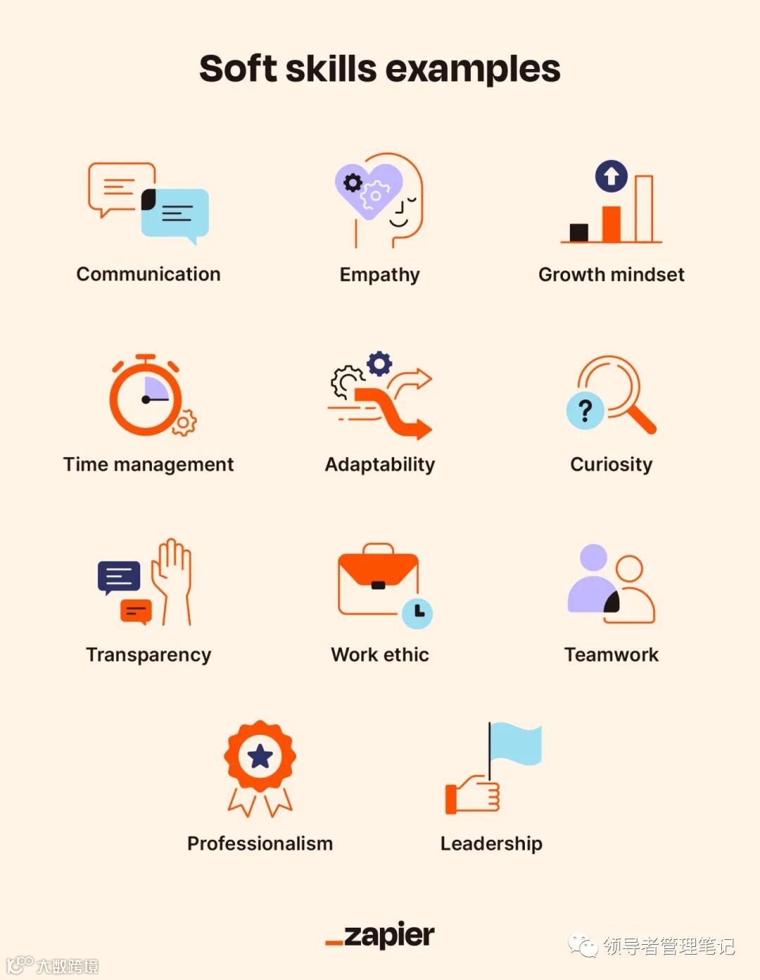 软技能是帮助你在工作中协作、领导、创造和成长的个人优势。它们是你所持有的观点、你的行事作风和心理框架,而不专属于你的工作。不要把“软”和“弱”混为一谈——比如,你可以持有同理心和好奇心,而不是残酷和自我。