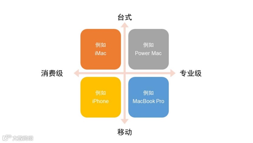 采用两个坐标轴,或者两种分类维度,苹果的产品就被分为了4类,分别是: