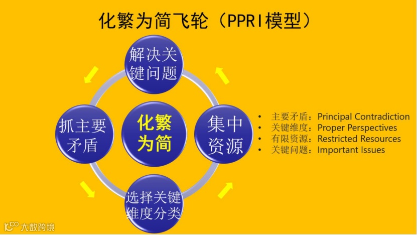 我们解决问题的方法是“化繁为简飞轮(PPRI模型)”,其精髓总结起来就是一句话:抓住主要矛盾,选择关键分类维度,从而集中有限资源解决关键问题。