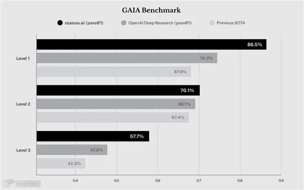 在GAIA基准测试中,Manus在所有三个难度级别都实现了对OpenAl Deep Research的超越。ps.GAIA是评估通用AI 助理解决实际问题方面的权威基准。