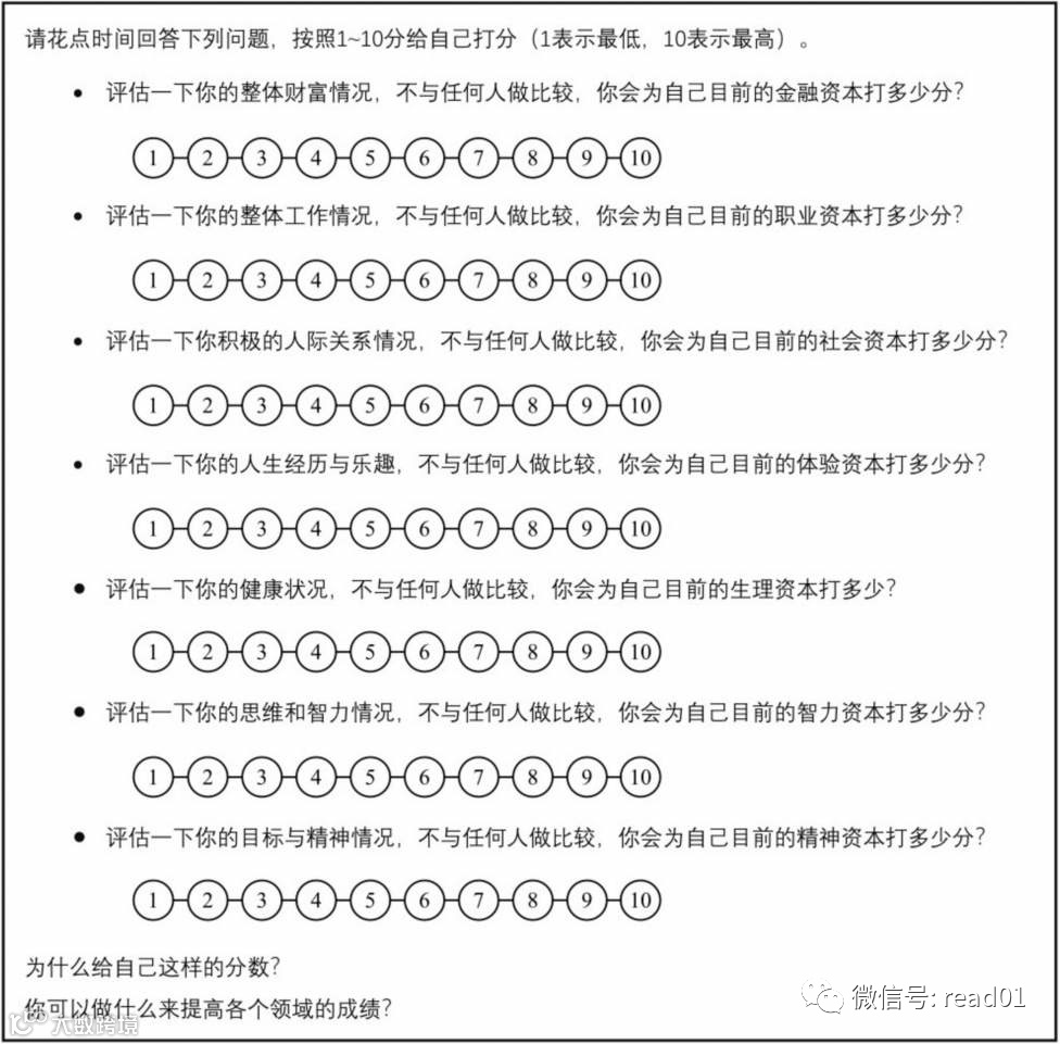 回顾一下构成你人生投资组合的各类资本,并思考你现在所处的阶段以及当你“投资”人生各个领域时想要达到的位置,然后完成人生投资组合的评估