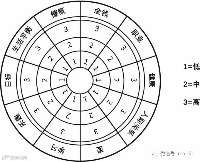 要想了解你现在处于什么阶段,第一步就是进行全面的人生评估。当你思考现在的人生时,请给自己的满意程度打分,在每一项中打上1、2、3(低、中、高满意度)。不要过度思考你的答案,只需写下你自然想到的任何答案。