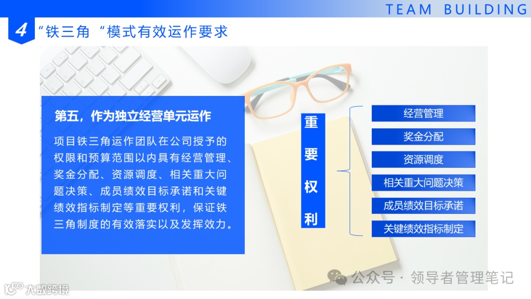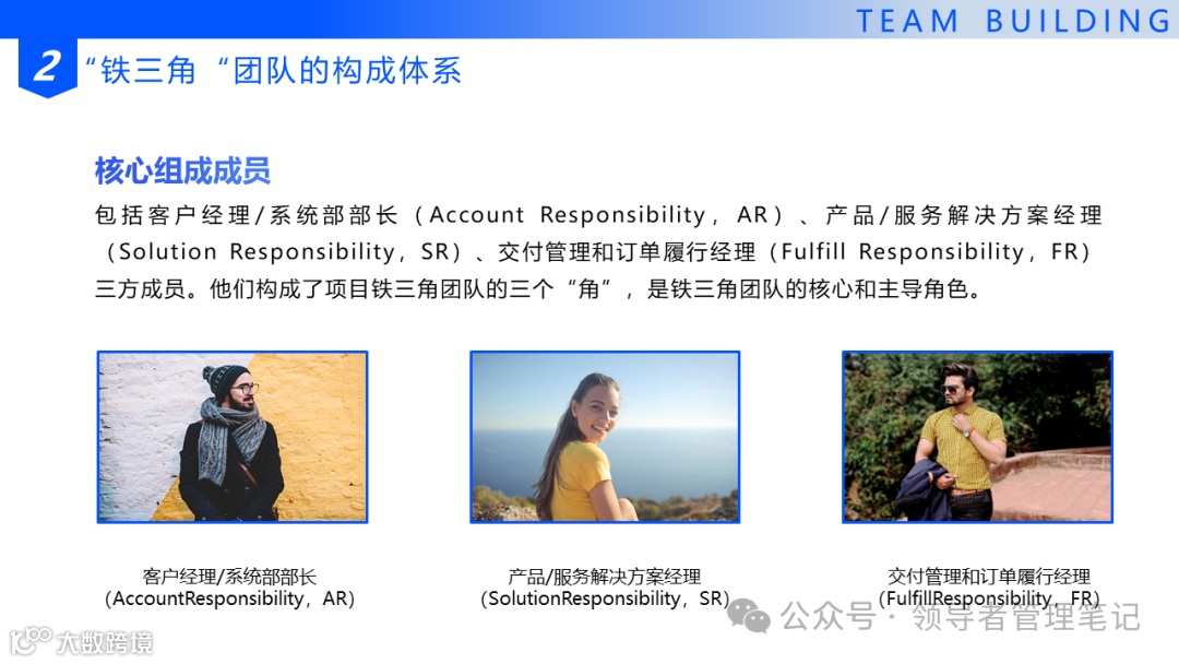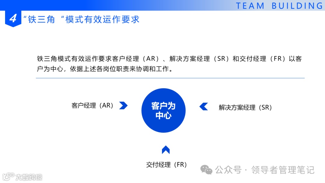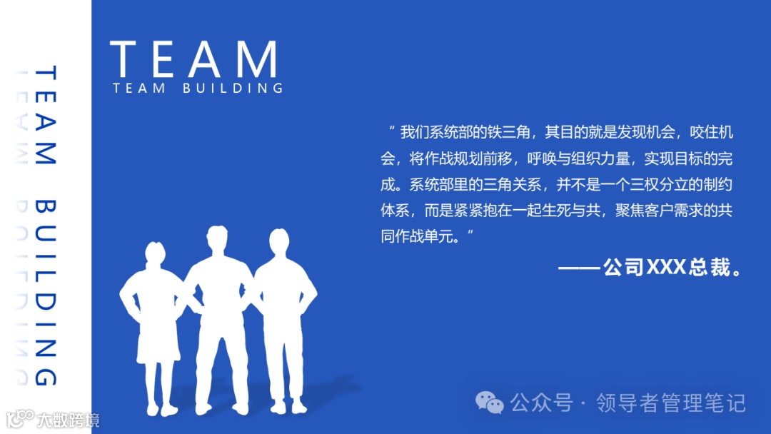 我们系统部的铁三角,其目的就是发现机会,咬住机会,将作战规划前移,呼唤与组织力量,实现目标的完成。系统部里的三角关系,并不是一个三权分立的制约体系,而是紧紧抱在一起生死与共,聚焦客户需求的共同作战单元。它们的目的只有一个:满足客户需求,成就客户的理想——华为任正非
