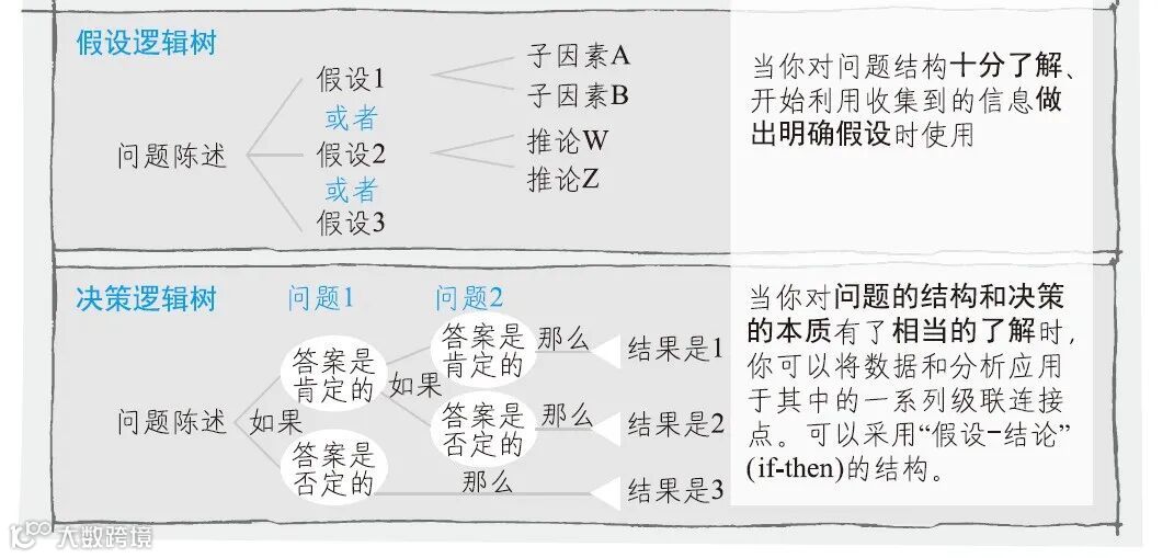 在这之后,经过反复应用数据和分析之后,我们通常会根据问题的性质转而使用假设逻辑树、演绎逻辑树或决策逻辑树。
