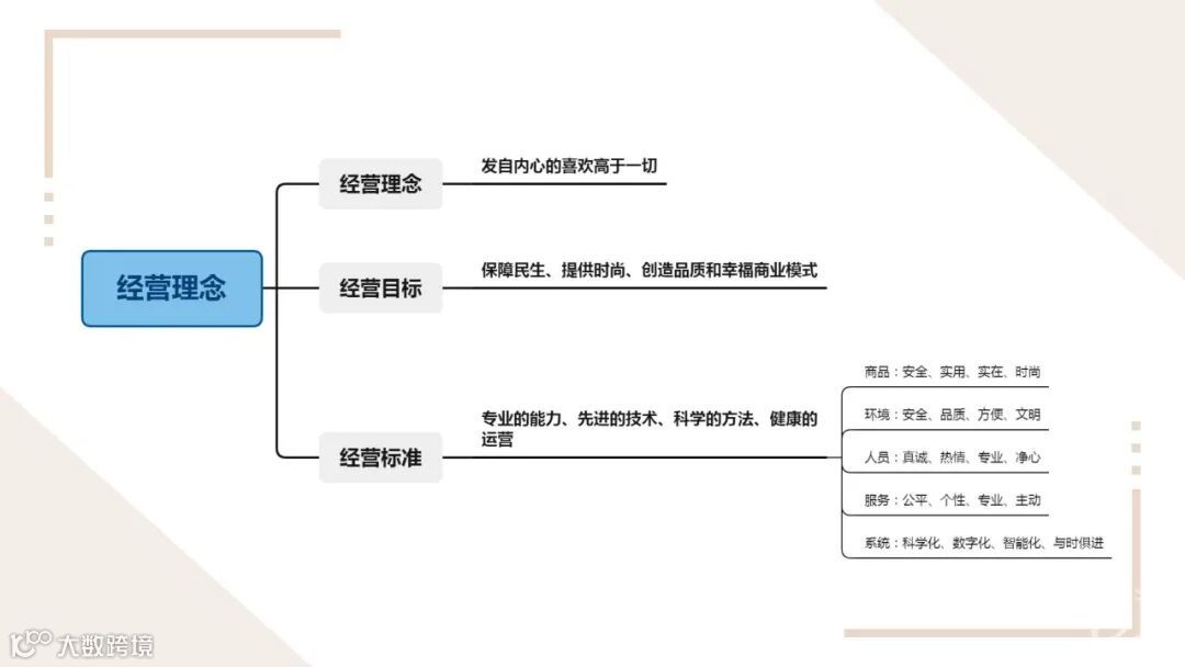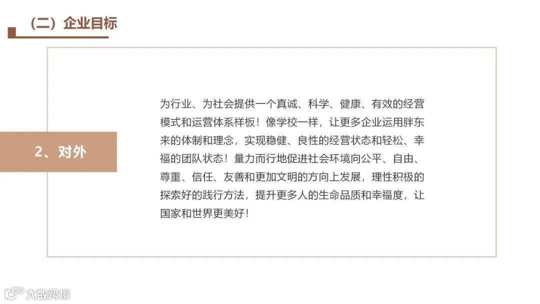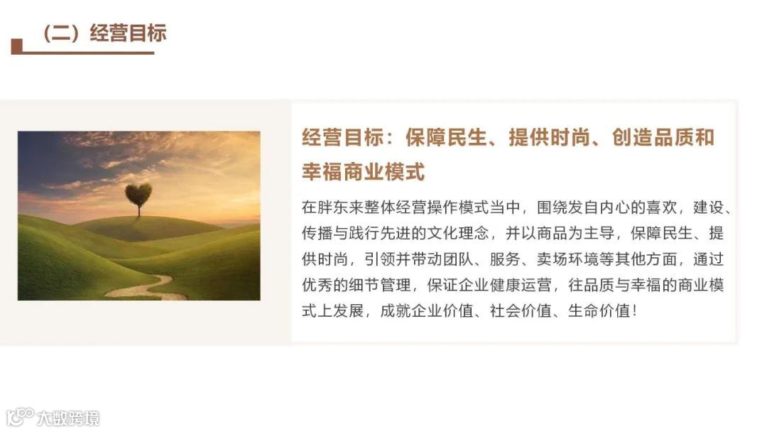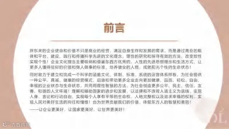 胖东来的企业使命和价值不只是商业的经营, 满足自身生存与发展的需求, 而是通过商业的载体和平台, 建设、 践行相传搭科学先造的文化理念 ,理性的研究和探寻有效的方法, 改变奴性 实现个性!