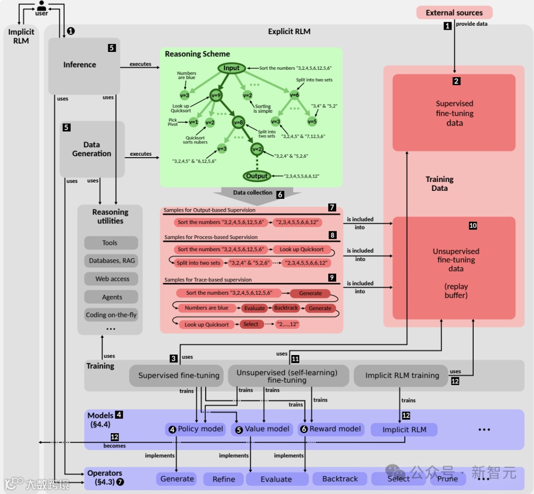 针对这一问题,近日联邦理工联合其他机构的研究人员,在arxiv发表了论文,基于对RLM研究工作的调查和分析,提出了全面的蓝图,将RLM组件组织为模块化框架,包含了不同的推理结构、推理策略和监督方案。