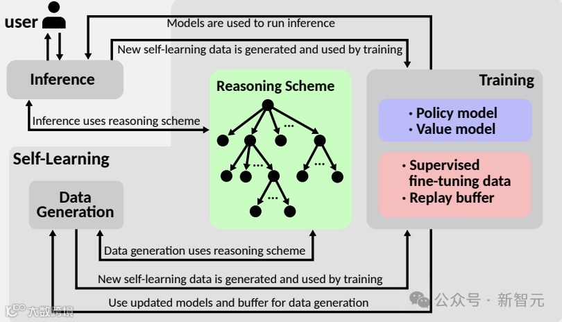 另外一些训练范式包括自我学习,其中模型通过生成和评估自身的推理序列进行迭代改进,从而模拟竞争或合作的推理场景。