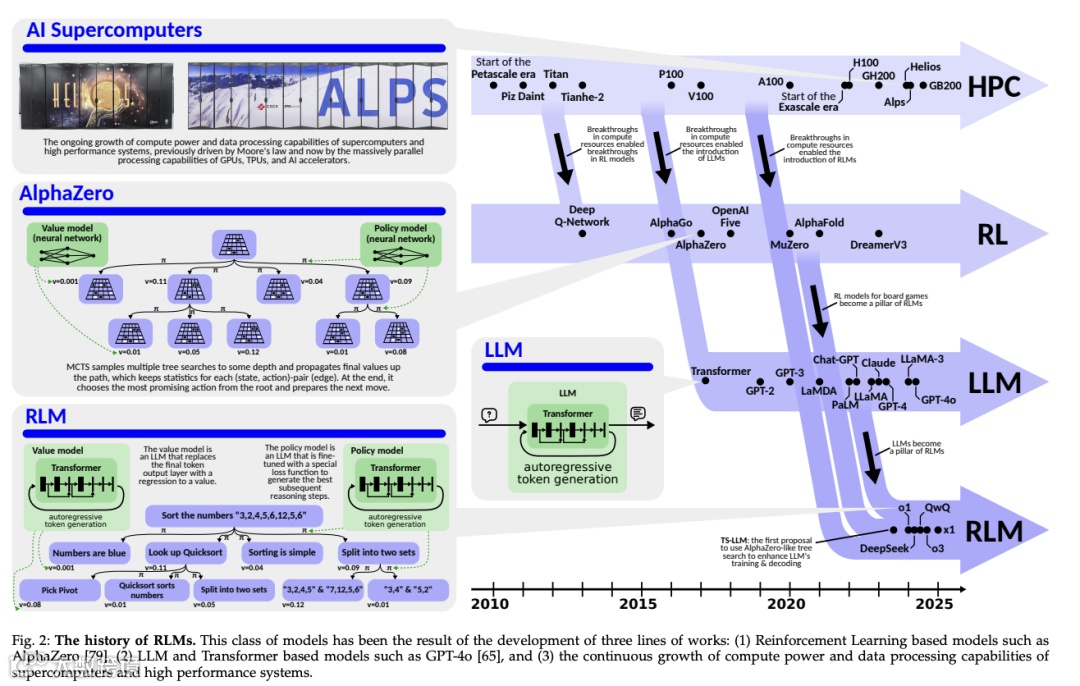图1:LLM、强化学习、高性能计算和RLM的演化历史