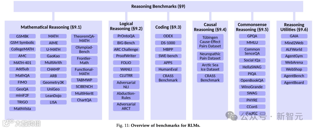 现在概述与RLM(推理语言模型)相关的基准测试。针对不同类型的推理,包括数学推理、逻辑推理、因果推理和常识推理,列出每个类别的代表性基准测试。