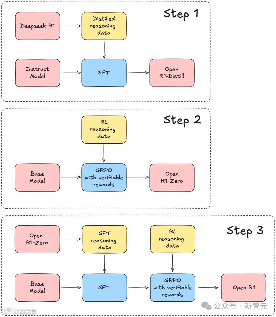步骤 2:复现DeepSeek用于创建R1-Zero的纯强化学习(RL)流程。这可能需要为数学、推理和代码任务策划新的大规模数据集。 -
