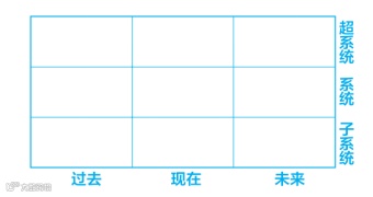 如上图所示,这个 3×3 分割的图其实就是九宫格。其中的横轴为时间轴,代表着过去的事实、现在的状况以及未来的变化趋势;纵轴为系统轴,若将个人或企业看为系统,那么超系统就是比企业或个人更大的环境,例如行业环境、大环境等,子系统就是比企业和个人更小的环境,例如一家公司所拥有的生产要素、资源或个人的技能、优势等。