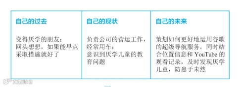 将自身的情况和公司的未来有可能的发展相对比,便可以进一步判断该公司的职位与发展环境是否符合自己的职业规划。如上图所示,A先生可以站在经常开车的驾驶者立场预测谷歌未来推出的超级车载导航,并提出希望自己将来能从事该项目的服务策划工作。