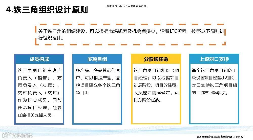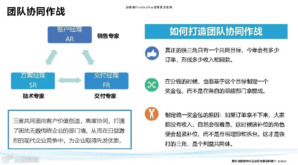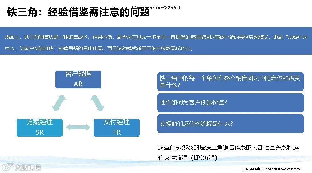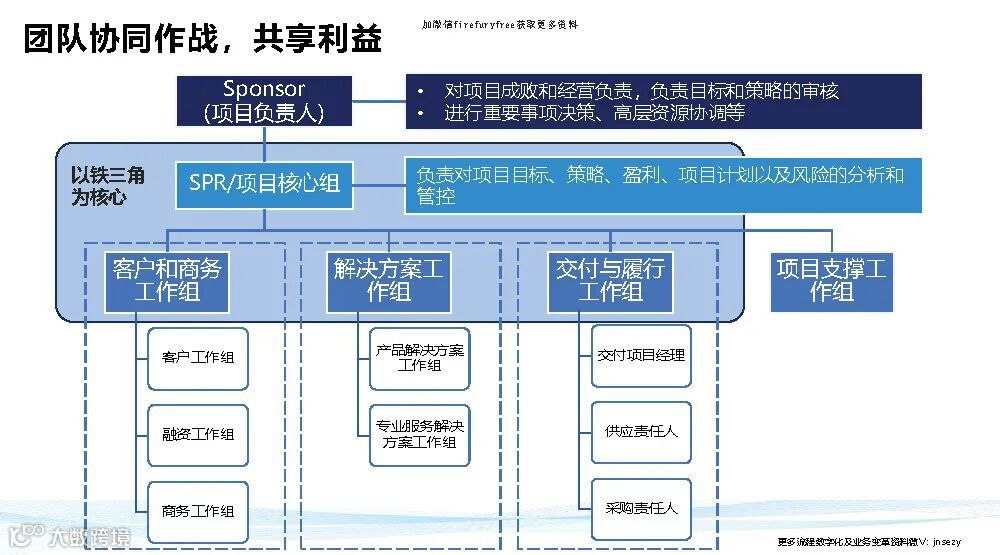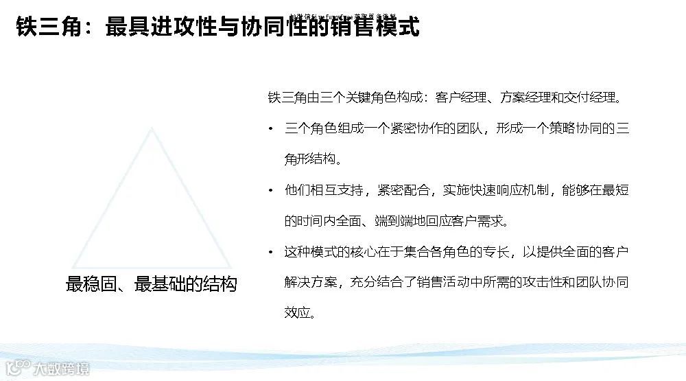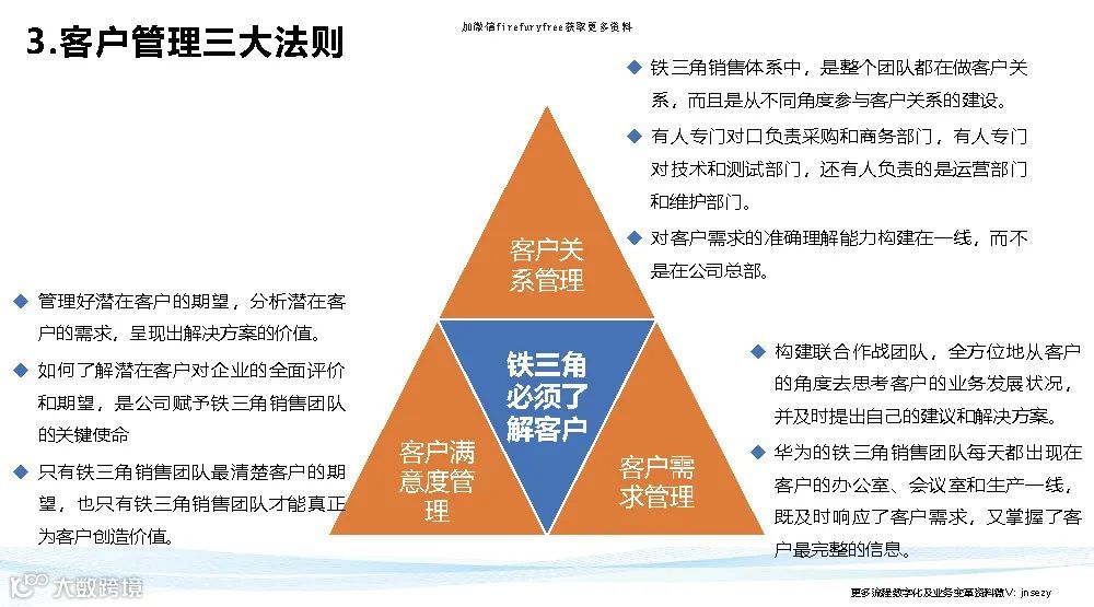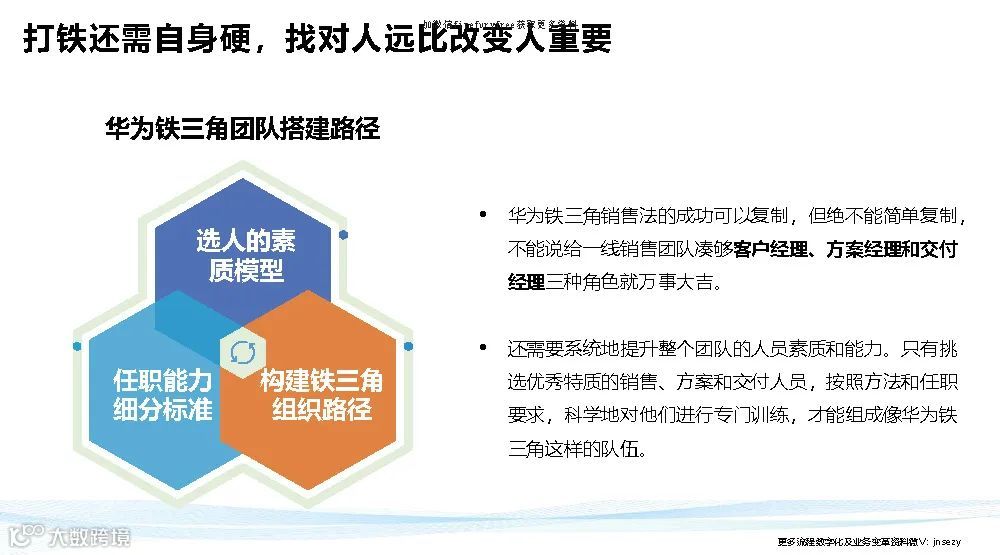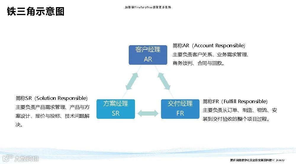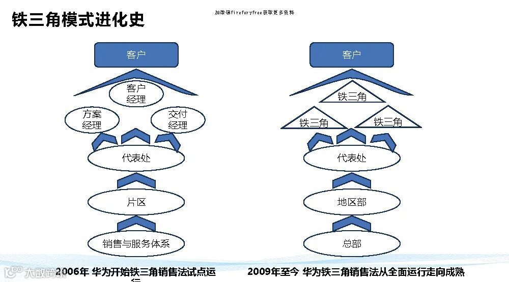 华为铁三角说白了就是把权力转移到前台,面对客户的这三个人(客户经理、产品经理、交付经理)的手上去,反向拉动组织为他们赋能。。
