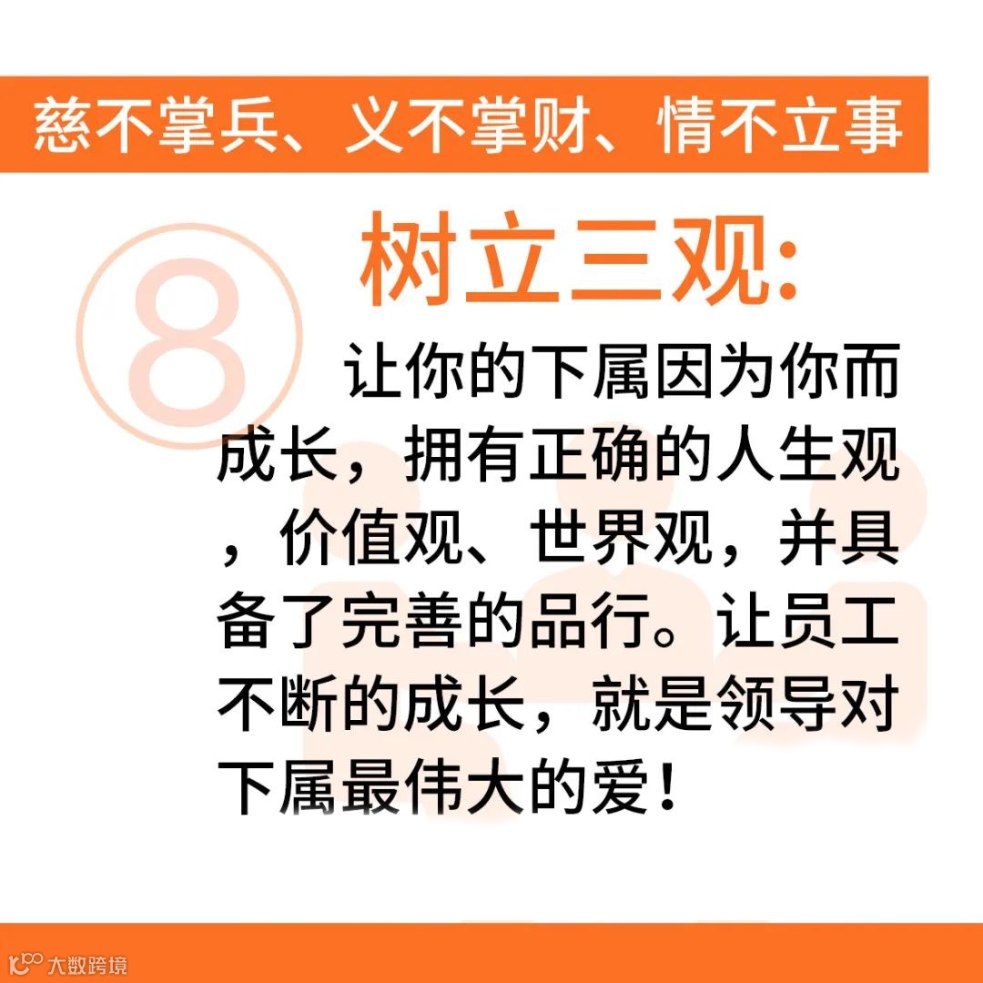树立三观:让你的下属因为你而成长,拥有正确的人生观,价值观、世界观,并具备了完善的品行。让员工不断的成长,就是领导对下属最伟大的爱!
