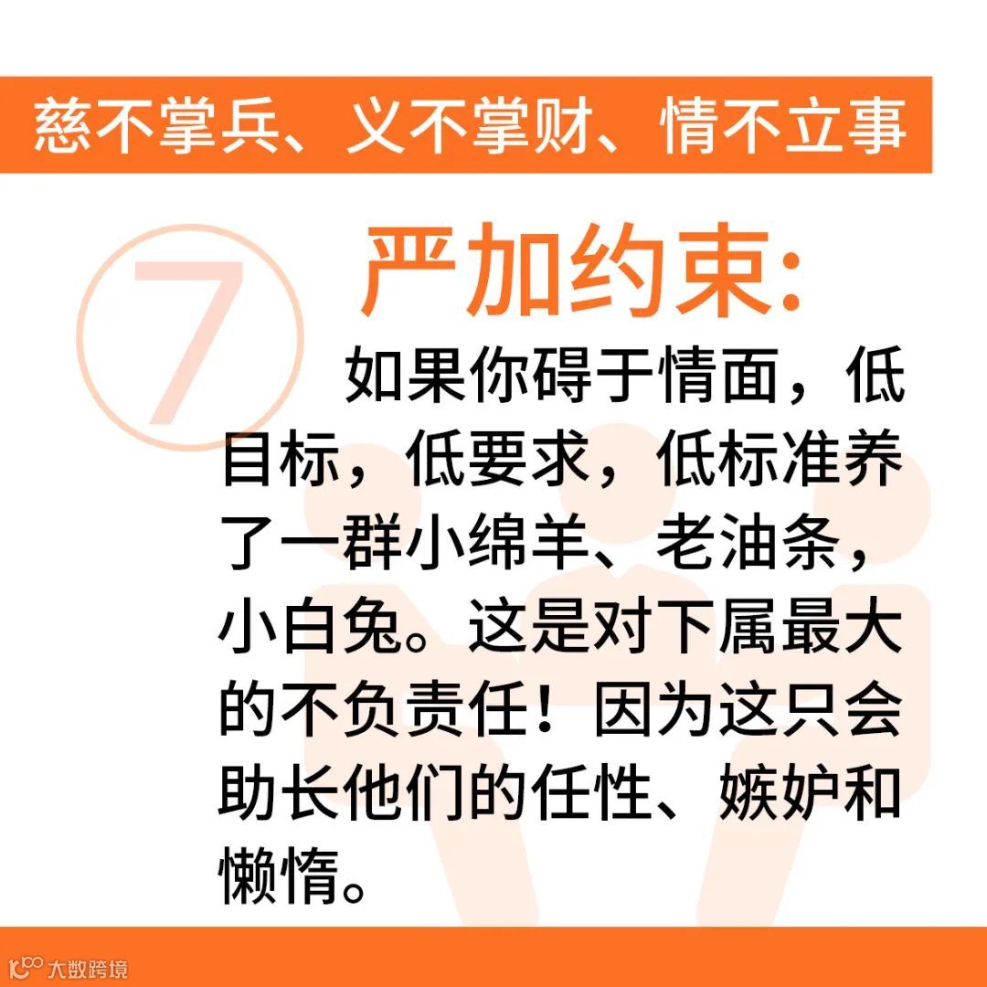 严加约束:如果你碍于情面,低目标,低要求,低标准养了一群小绵羊、老油条,小白兔。这是对下属最大的不负责任!因为这只会助长他们的任性、嫉妒和懒惰。