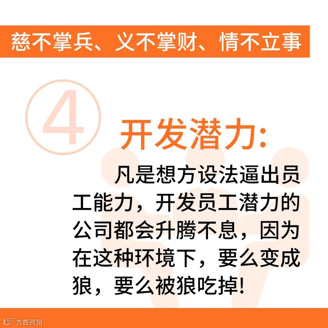 开发潜力:凡是想方设法逼出员工能力,开发员工潜力的公司都会升腾不息,因为在这种环境下,要么变成狼,要么被狼吃掉!