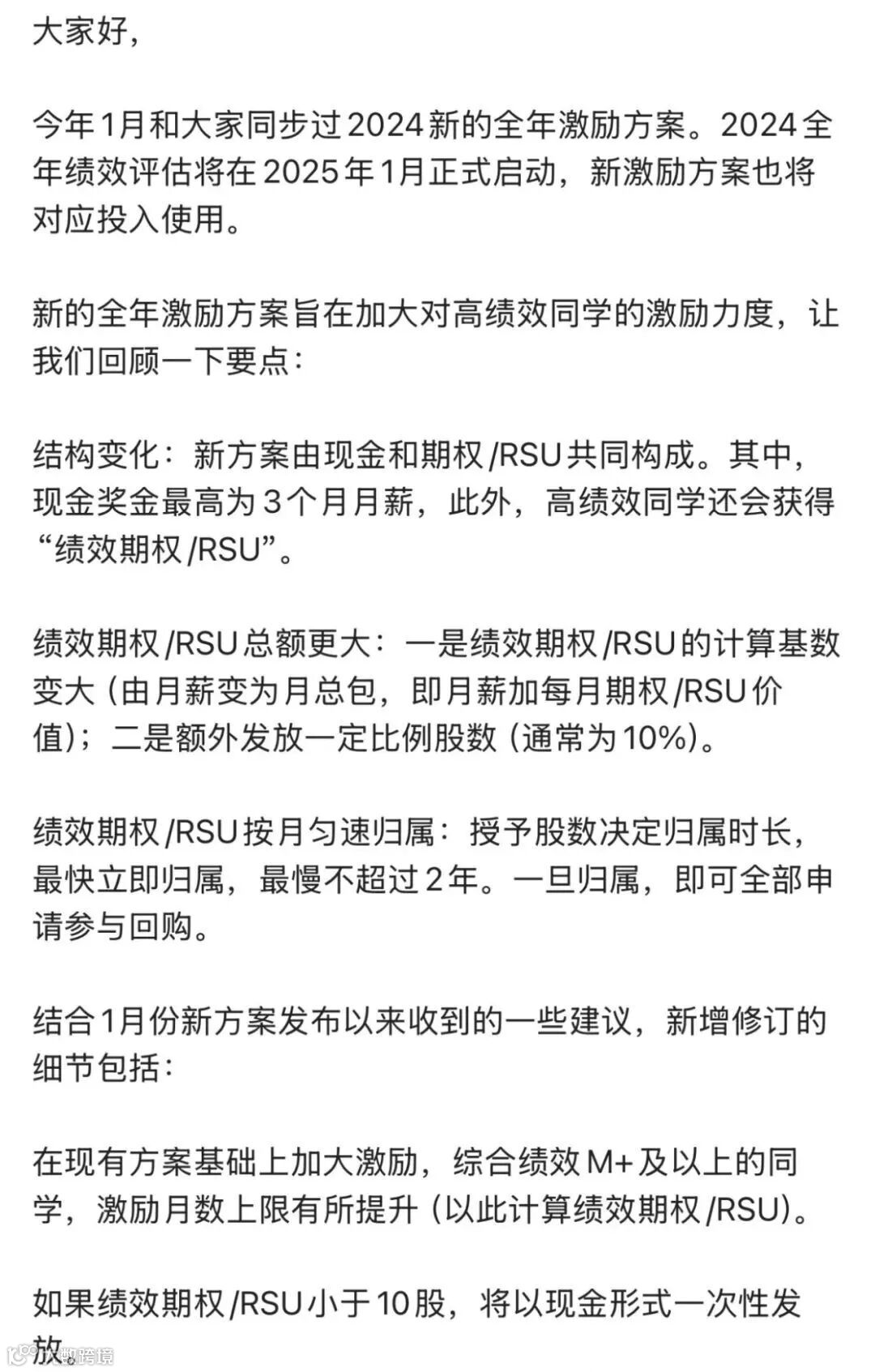 而本次改革,明确提出目标年终奖统一调整为3个月。实际奖金有超出3个月的部分,以绩效期权或RSU形式发放。