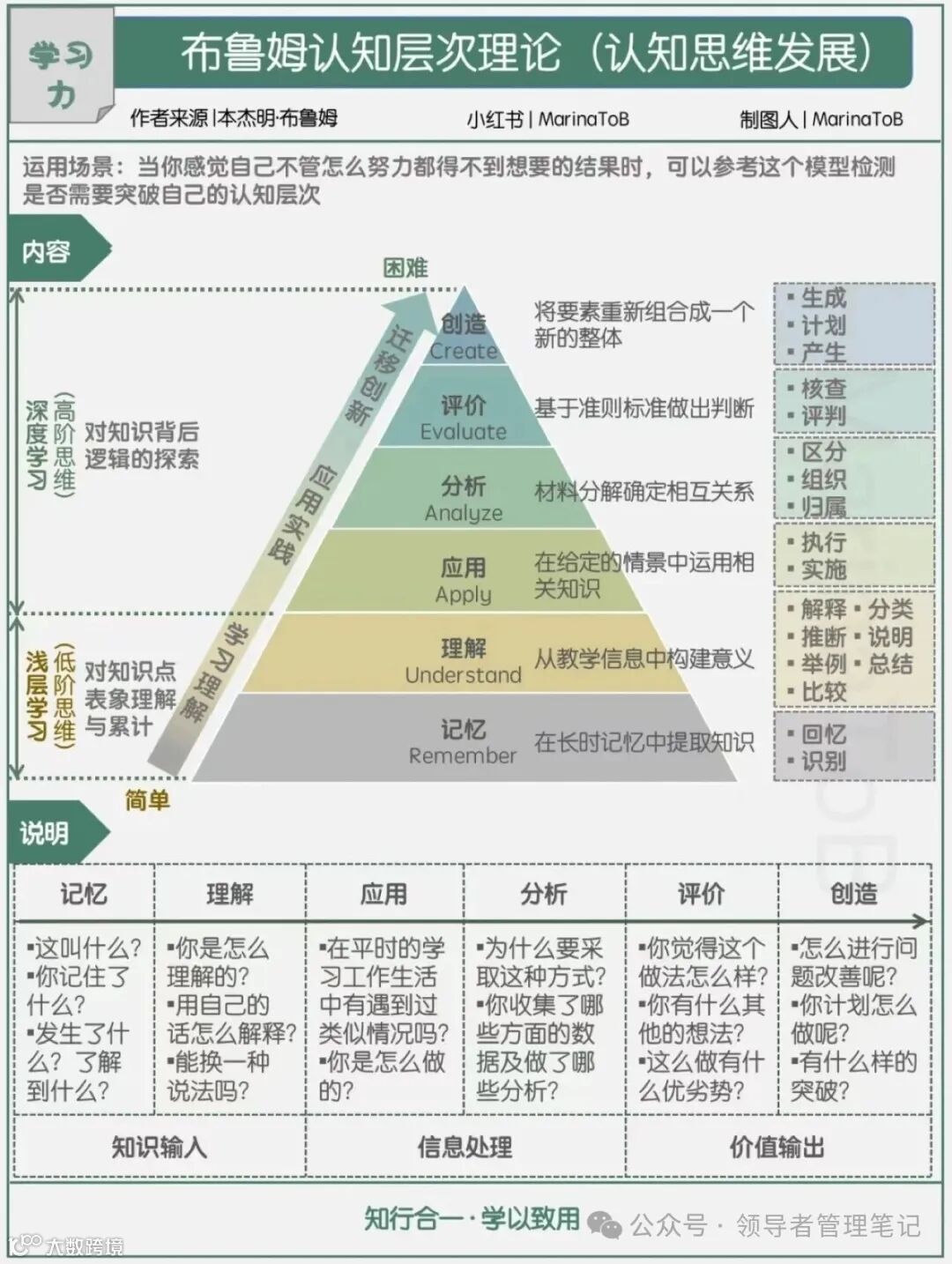 6. 创造(Creative):综合层次要求学习者将不同的信息或概念组合起来,创造新的整体或解决方案。他们应该能够提出新的假设、设计实验、制定计划或构建模型等。