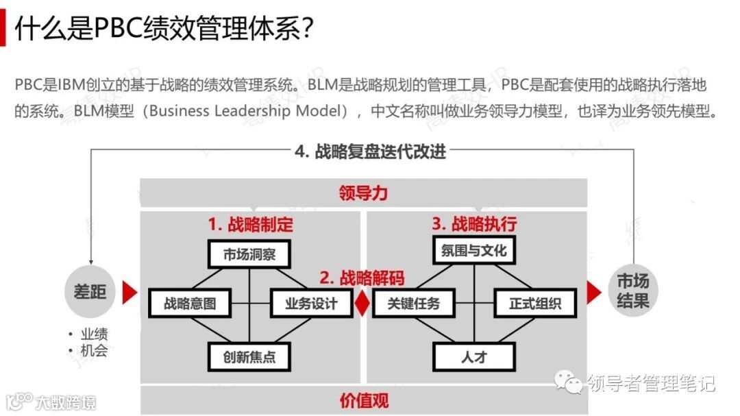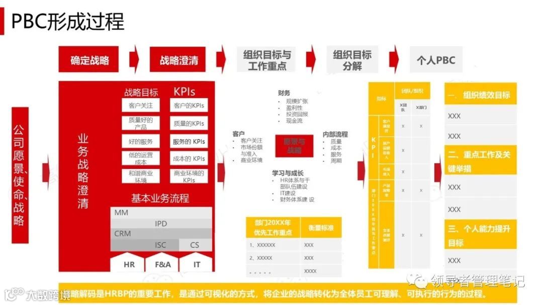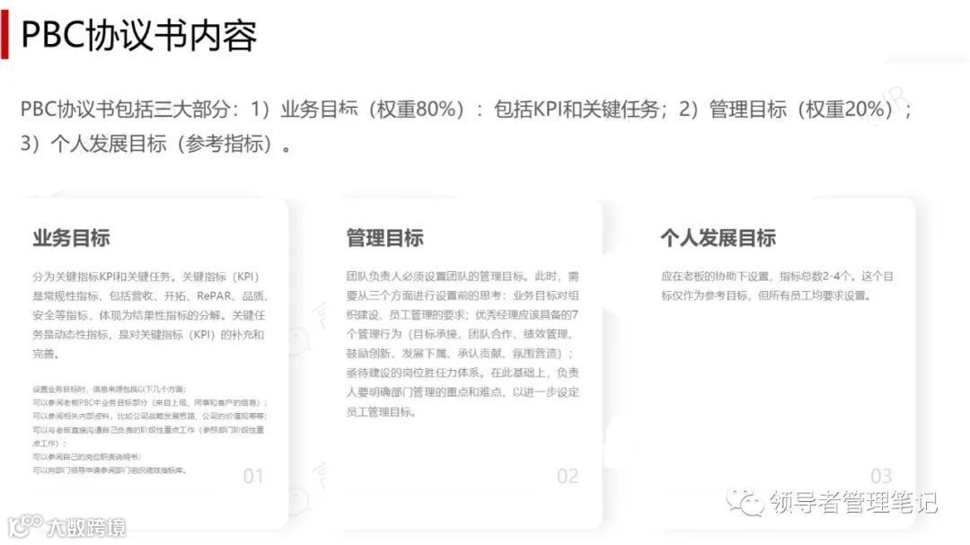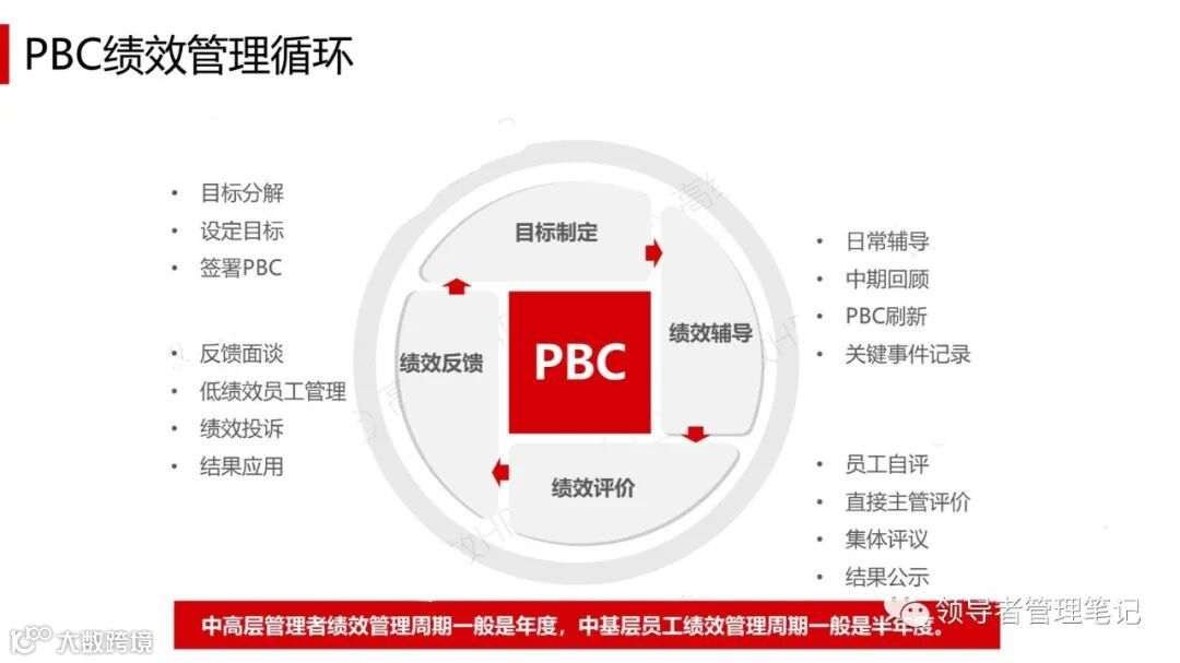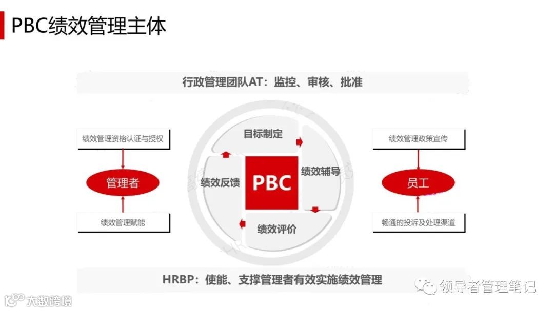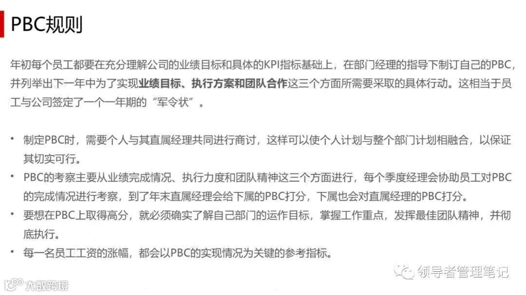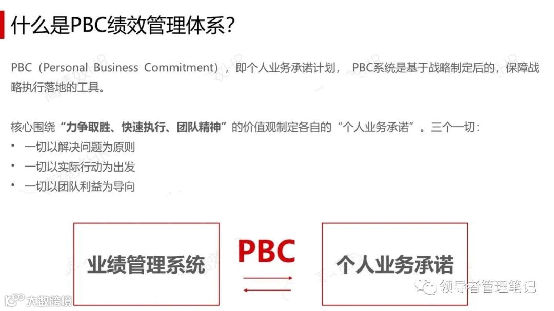 PBC以承诺为核心,它强调的重点是目标自上而下分解,下层员工的绩效承诺之和就是其上司的绩效承诺,通过PBC牵引员工的关注和提升组织绩效。
