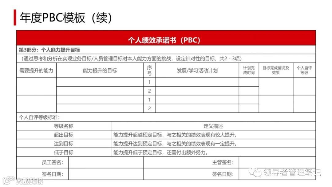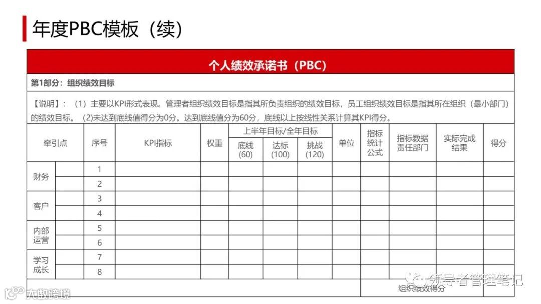 通过基于PBC的绩效管理,可以帮助管理者梳理思路,聚焦重点。把有限的时间和精力放在最重要的事情上,拒绝没有意义的管理消耗。最常见的PBC考核表分别由组织绩效目标、个人绩效目标、能力提升计划三大部分组成。