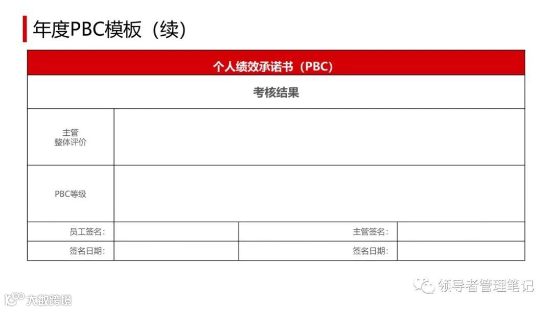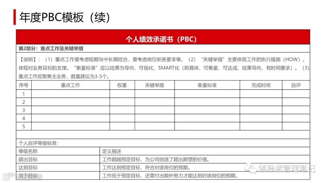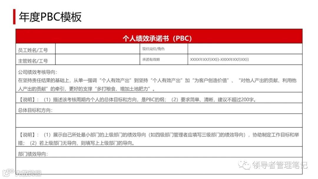 PBC(Personal Business Commitment),即个人业务承诺计划,是围绕于“工作目标”“权重”“具体工作计划”三个方面进行的绩效管理。
