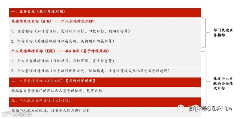 组织绩效目标、个人绩效目标和能力提升计划三部分构成个人考核目标结构。其中组织绩效目标是指选取直接承接的所在部门的组织绩效目标,引导员工关注组织整体目标;个人绩效目标是指基于岗位职责和角色要求,突出个人贡献;能力提升计划主要是基于达成目标所需的知识技能的短木板,完善个人工作能力。