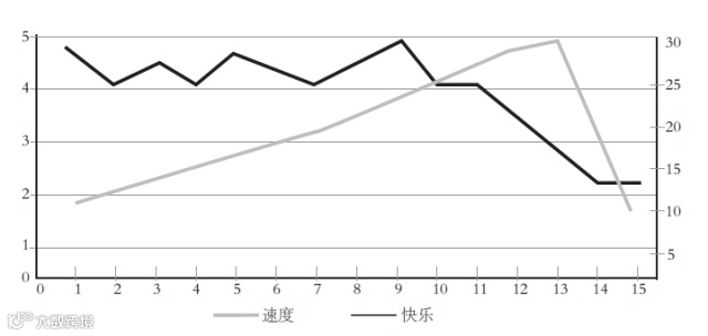 比如,根据下面这张图所示,在工作速度或者说效率开始下跌的几个星期之前,员工的快乐水平就已经开始下跌了。如果你仅仅盯着效率,那么直到它骤然下跌,你才发现问题。但如果你发现整个团队的快乐水平有所下降,那么即便当前的效率在提高,你也能提前判断出自己需要着手解决某个问题了,而且要尽快解决。