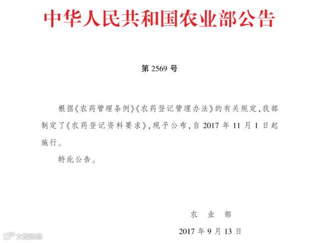 根据《农药管理条例》《农药登记管理办法》,发布《农药登记资料要求》,该要求自2017年11月1日施行。