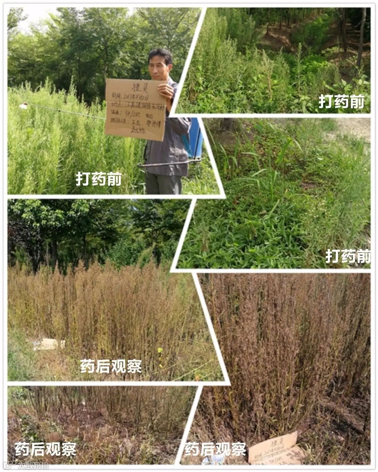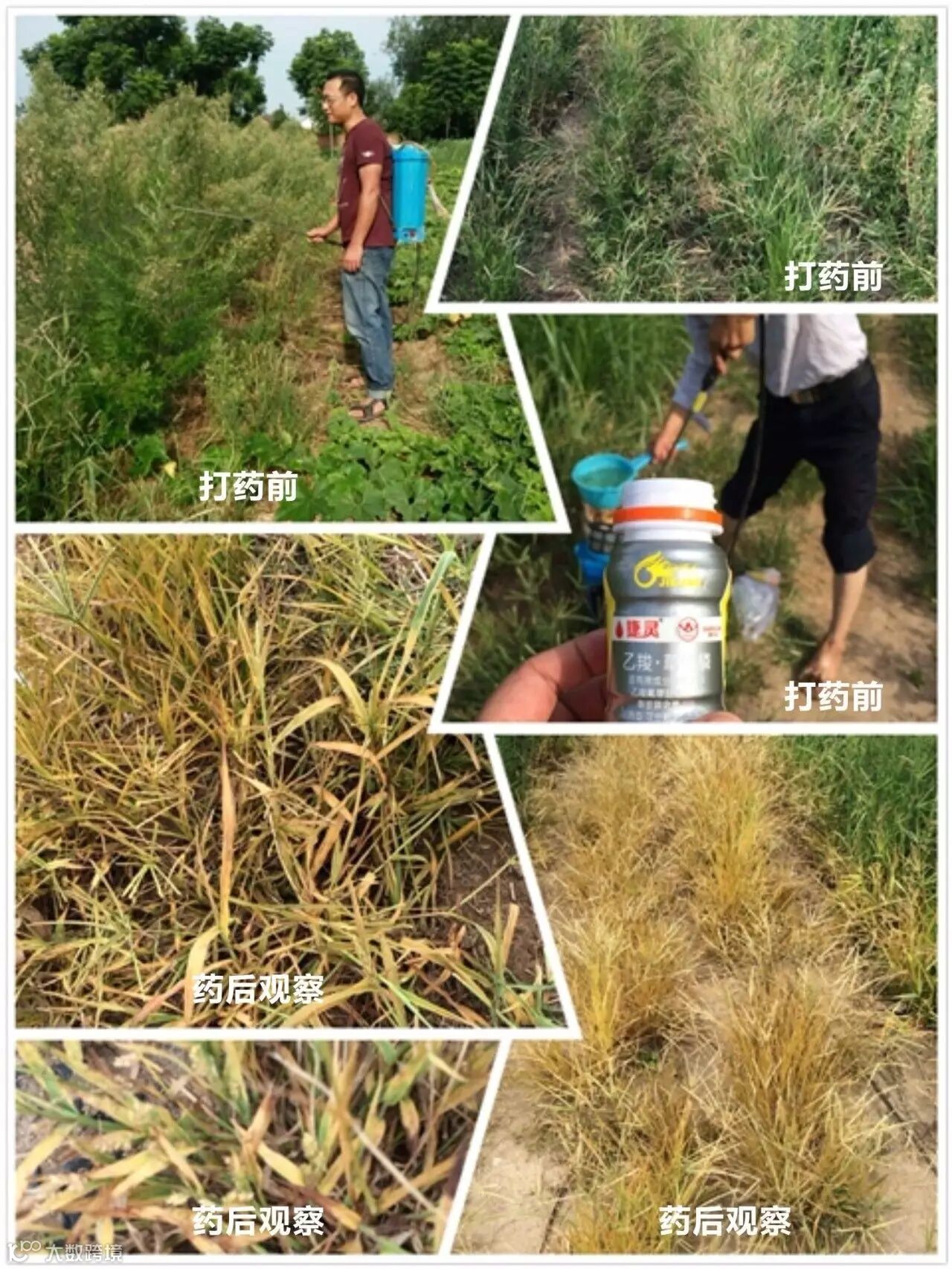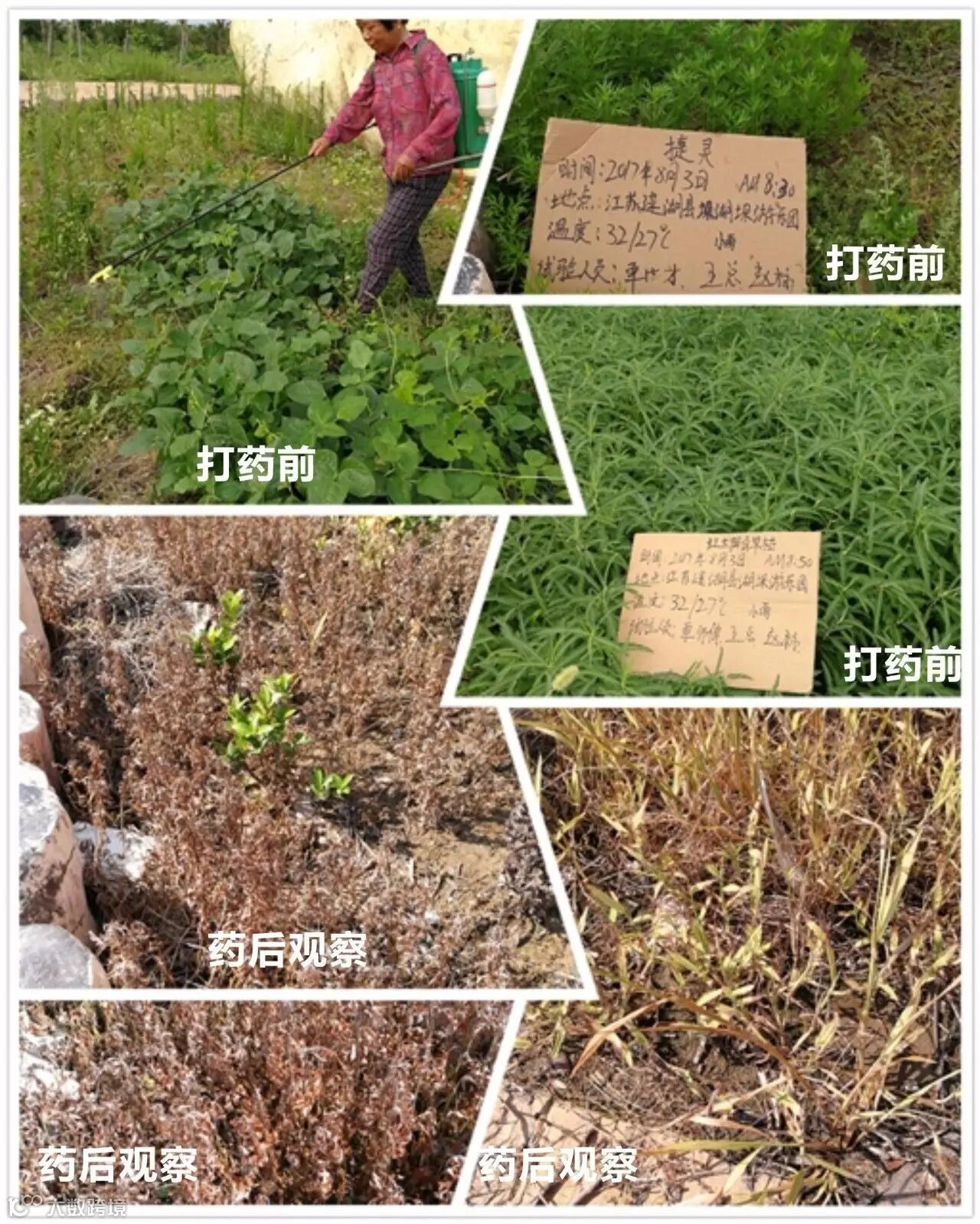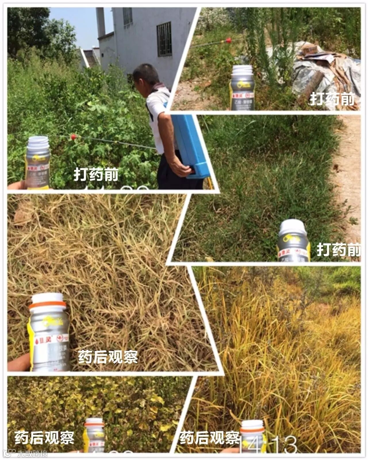 田间情况:当天气温在32-28℃多云,上午九点左右在种植树苗的园圃中,我们选择了排水渠和部分路边进行打药.采用电动喷雾器一瓶捷灵一壶水的用量。施药地块主要有小飞蓬.牛筋草马唐.水花生还有部分阔叶植被等杂草,用药时均匀喷到。遇到特别茂盛较大杂草(小飞蓬)的地方都会喷透、淋湿。药后第四天农户就反映有很多杂草死亡.第八天去观察时,马唐、牛筋草、小飞蓬及阔叶草已经都叶面枯黄甚至变黑死亡。观察时发现像牛筋草这种顽固杂草,建议喷透!