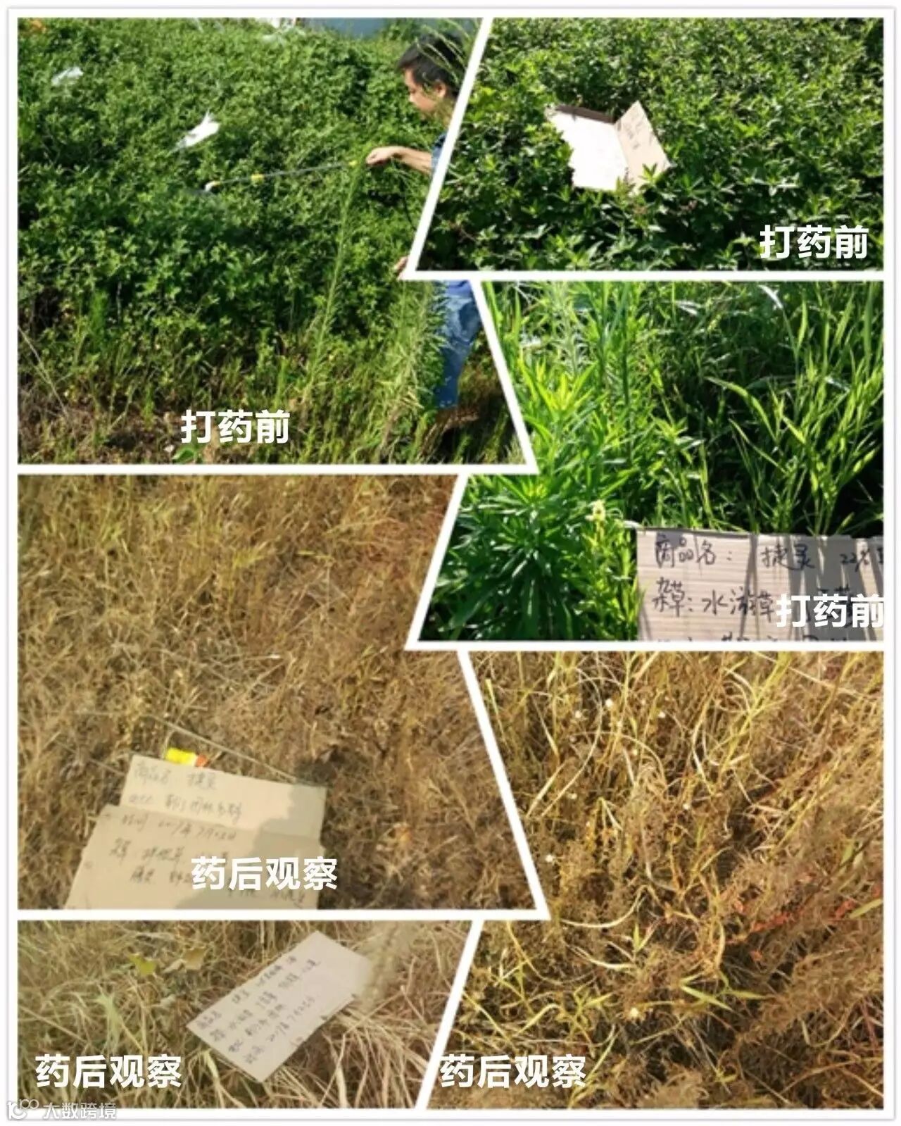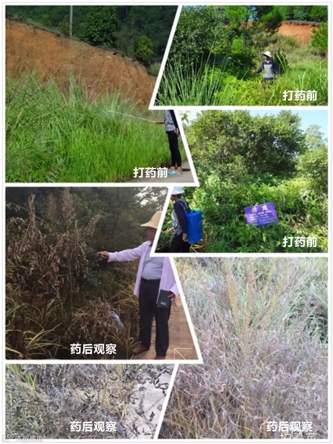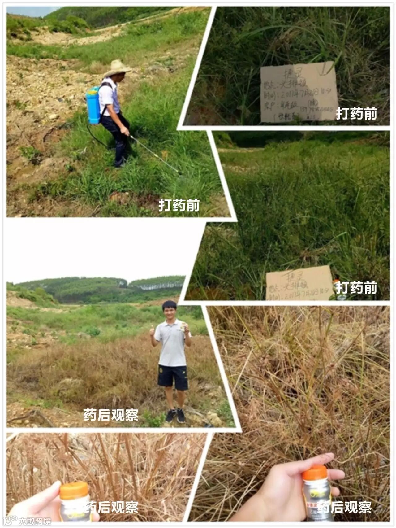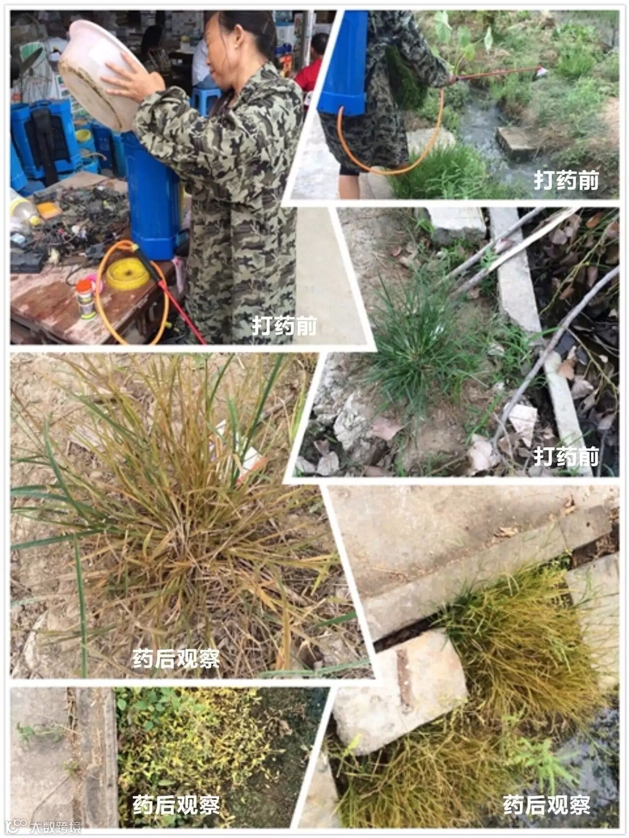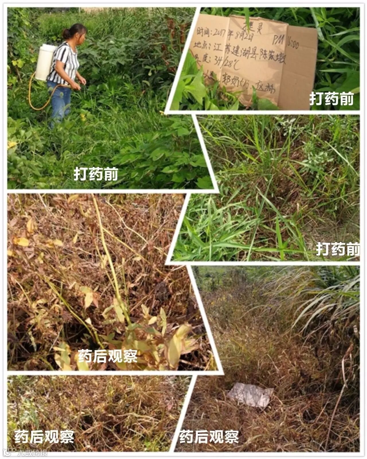 田间情况:当天气温在32-28℃多云,上午九点左右在种植树苗的园圃中,我们选择了排水渠和部分路边进行打药.采用电动喷雾器一瓶捷灵一壶水的用量。施药地块主要有小飞蓬.牛筋草马唐.水花生还有部分阔叶植被等杂草,用药时均匀喷到。遇到特别茂盛较大杂草(小飞蓬)的地方都会喷透、淋湿。药后第四天农户就反映有很多杂草死亡.第八天去观察时,马唐、牛筋草、小飞蓬及阔叶草已经都叶面枯黄甚至变黑死亡。观察时发现像牛筋草这种顽固杂草,建议喷透!