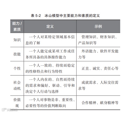 冰山模型中主要能力和素质的定义详见表5-2。人才画像就是依据岗位职责和绩效目标要求,将胜任该岗位所应具备的知识、经验、技能、价值观、动机、品性等用语言描述出来,这就构成了人才画像。