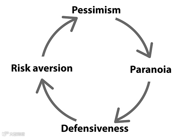 罗伯特·艾格将领导力中的悲观主义问题总结为一个简单的恶性循环,如下图所示:悲观主义 → 偏执怀疑 → 戒备心重 → 规避风险。