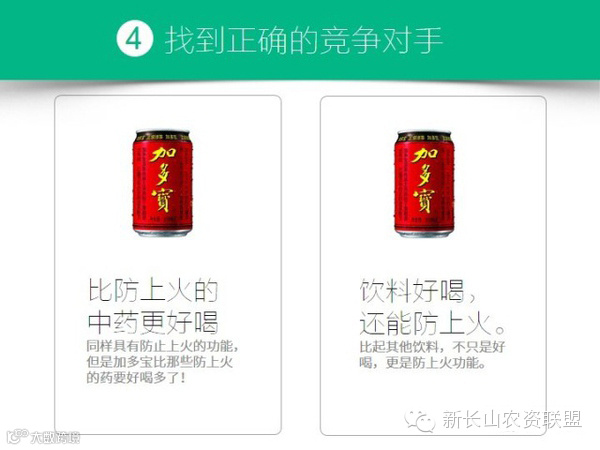 比如上图中,我假想的上述两种加多宝凉茶的文案,前一种是跟预防上火的中药比,虽然更加突出了“防上火”功能,但是人觉得“是药三分毒”,可能不敢喝;后者跟饮料比,增加了“防上火”功能,给人感觉“不再为喝不健康饮料而有负罪感”了。