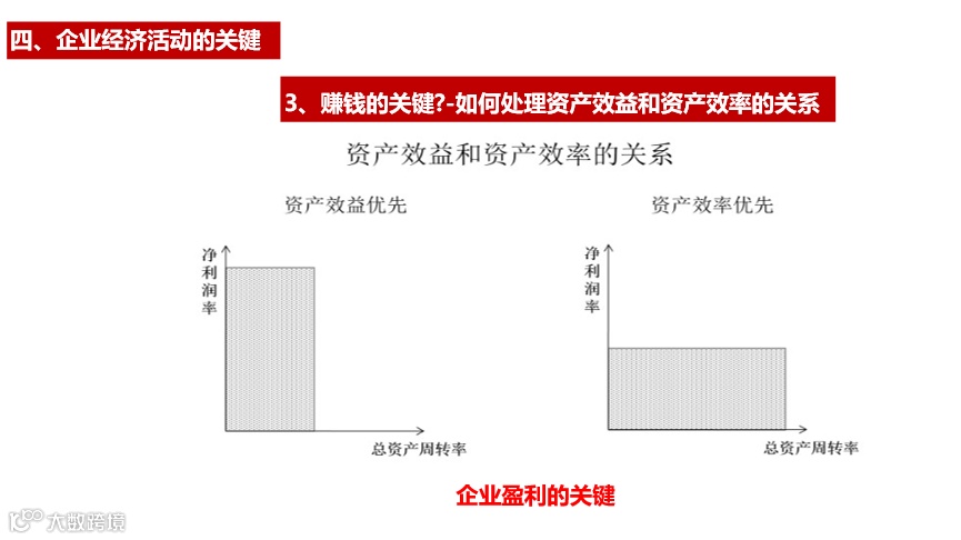 从上面的分析,我们可以推导出企业经营的本质就是盈利。而盈利的关键点,就是两个要素:一个叫资产效益,一个叫资产效率。