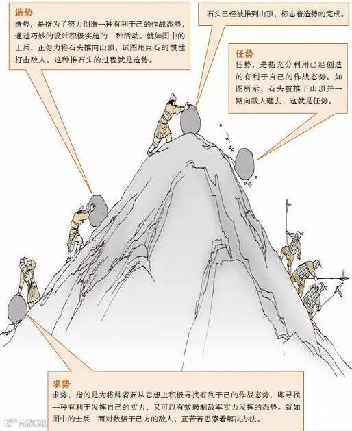 孙子作为一个尚智的军事谋略家,十分强调要积极主动地追求于己有利的“势”,创造于己有利的“势”,并且充分利用于己有利的“势”。