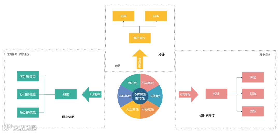 心智模型是根深蒂固存在于人们心中,影响人们如何理解这个世界(包括我们自己、他人、组织和整个世界),以及如何采取行动的诸多假设、成见、逻辑、规则,甚至图像、印象等下图对心智模型六大特性进行分类,表现了人们认知的维度。