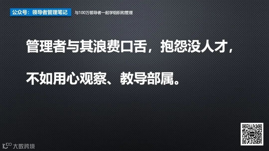 总而言之,管理者与其浪费口舌,抱怨没人才,不如用心观察、教导部属。正如管理大师吉姆·柯林斯所说:“优秀的领导者不是抱怨没有人才,而是培养并发挥每个人的潜力。”这才是管理者应有的态度和行动。
