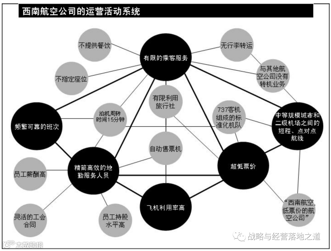 为了帮助读者更好理解配称一词,以一个案例说明。大家都知道美国西南航空公司的案例,西南航空公司的战略囊括了整个企业内的运营活动系统,而不是各个部分的简单集合。它的竞争优势来自各项活动之间的配称(fit)和相互加强。由于各项运营活动围绕“单一经济舱飞行”定位整合在了一起,形成战略配称,这就超出了单项运营效益的简单集合。