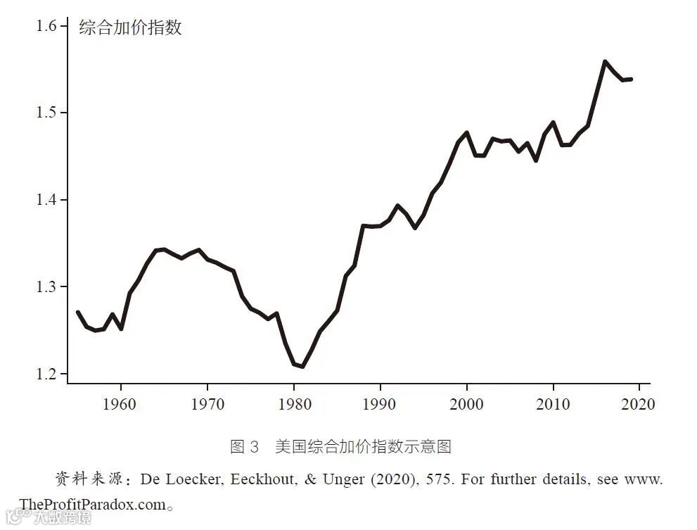 这一串新数据不仅忠实地记录了市场支配力的演变过程,同时也反映出市场支配力随时间的变化规律。如图所示,1980—2019 年,美国的平均加价指数一直在急剧攀升,其数值从1.21 一路涨到了1.54。这意味着1980年时,商品的售价只比成本高21%,而现在,商品的售价足足比成本高出了54%。另外我们还可以看到,加价指数在1980—1990 年出现了极为夸张的增长,之后在2000—2010 年又出现了长达十年的停滞。在经历了全球性的经济危机之后,这一指数又出现了新一轮的大幅上涨。