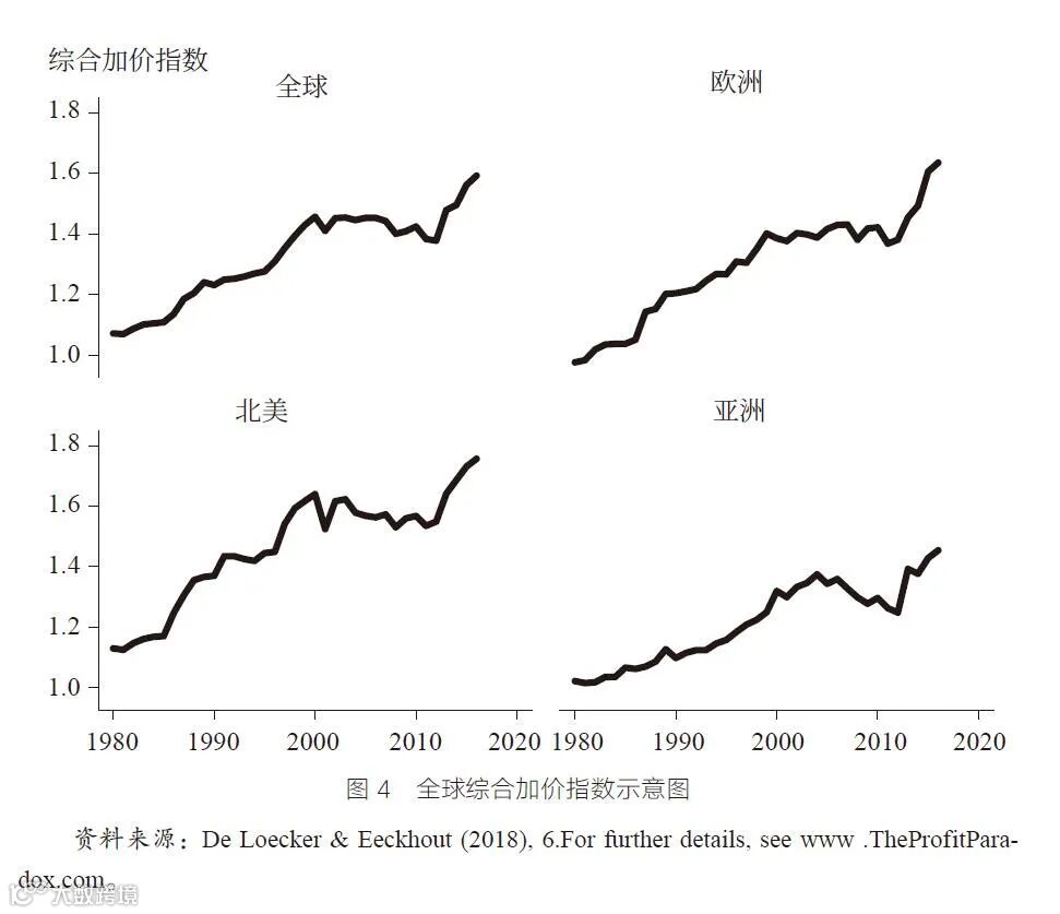 这种增长规律是全球性的。除美国之外,类似规律也出现在了欧洲、北美洲和亚洲等地区。从全球的角度来说,加价指数在1980—2000 年有所增长,在2000—2010 年出现了10 年的停滞,直到2010年全球经济危机结束之后才重新开始快速增长。不可思议的是,各个大陆的变化规律和全球的变化规律没有太大差别,尤其是欧洲和美国这两个地区,虽然前者的起始数字较低,但二者几乎拥有相同的变化规律。总而言之,根据我们的发现,世界各地几乎都出现了市场支配力增长的现象。