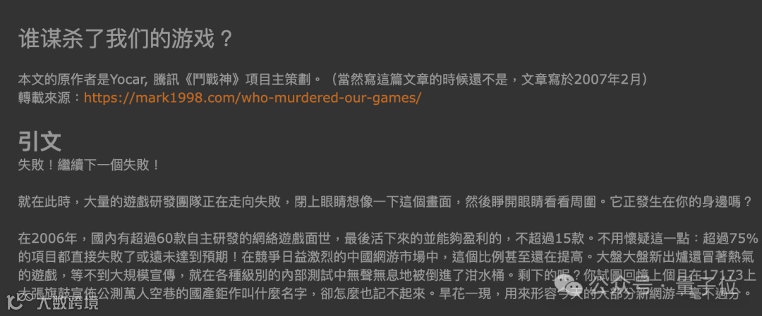 入行不久,他就写过一篇「谁谋杀了我们的游戏」里面不乏对于现代游戏发展的思考。开篇就是:失败!继续下一个失败!
