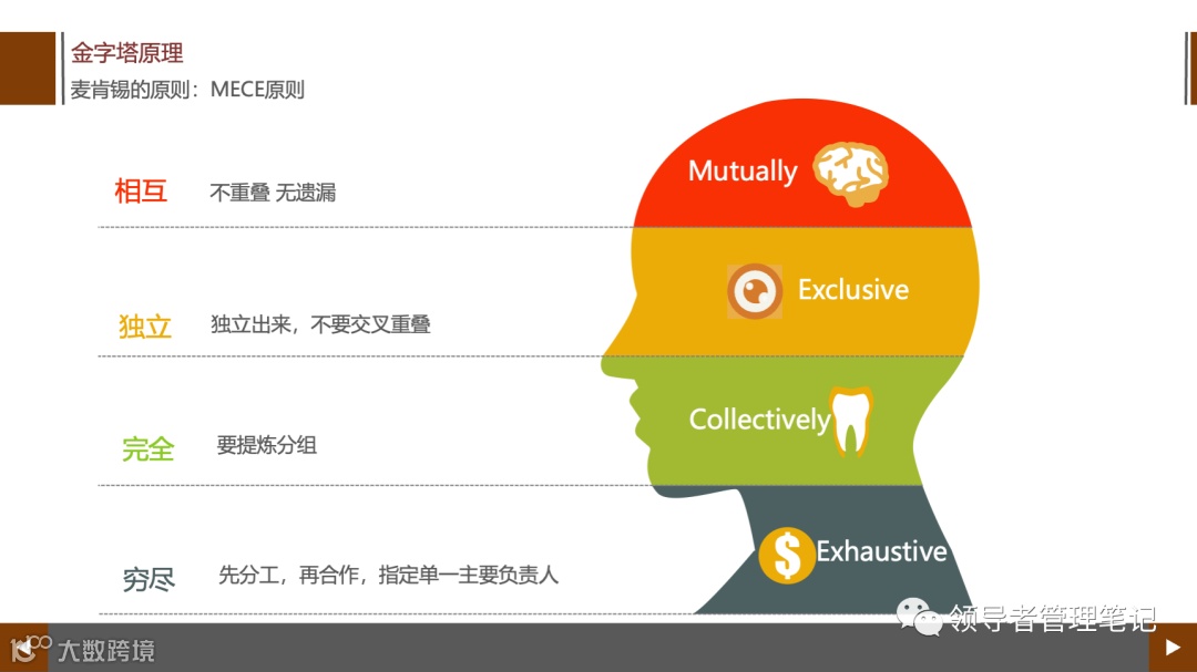 MECE原则的优点在于它可以防止在解决问题时出现漏洞和重复,使问题的分析和解决更加全面和有效。在解决问题的过程中,MECE原则可以帮助我们将问题分解成更小的、更易于管理的部分,并将这些部分独立地加以解决,从而更好地理解和解决问题。