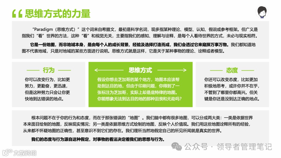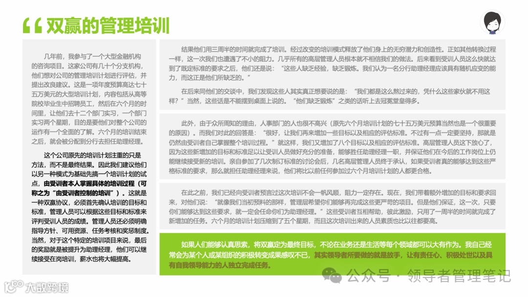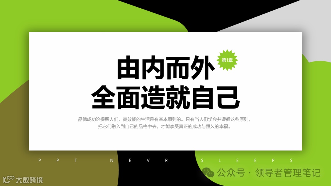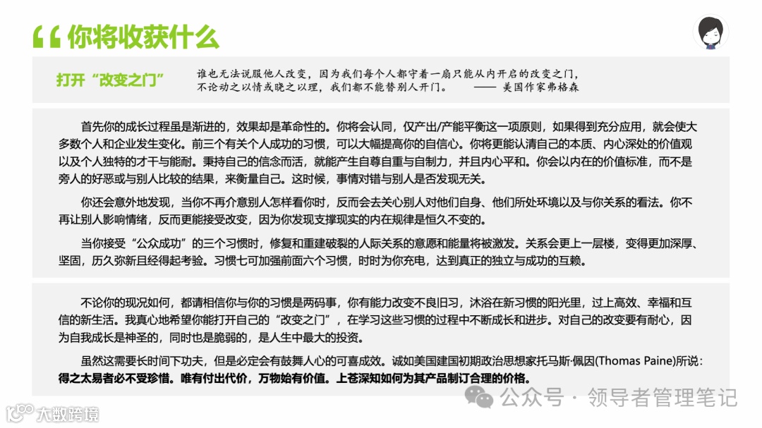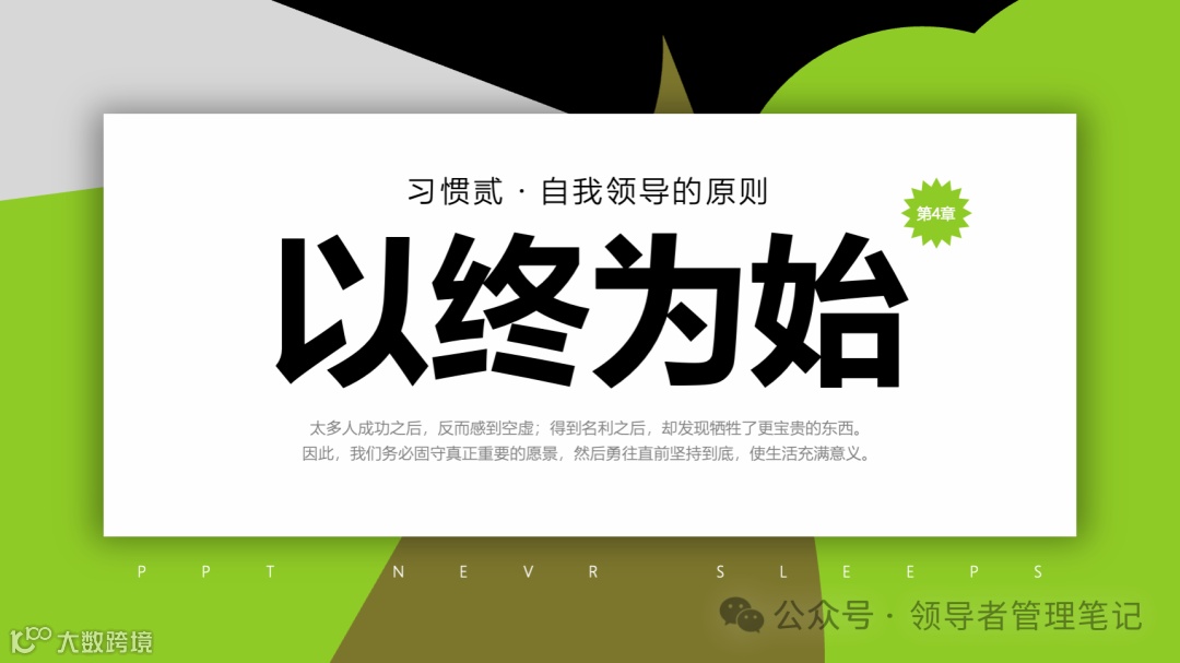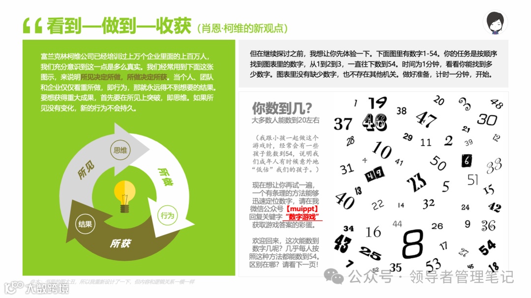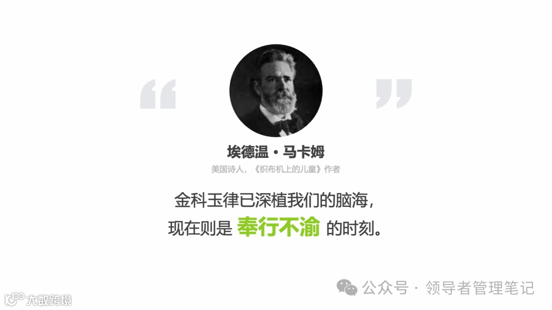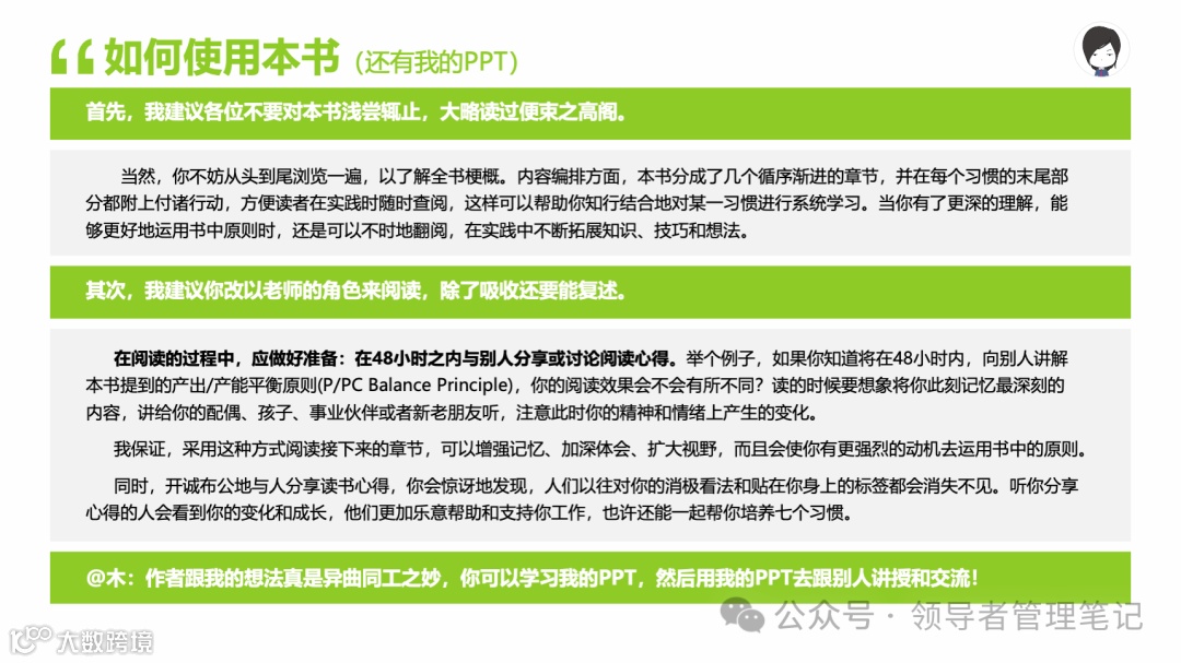 重要消息:微信公众号又改版了,即便我每天都按时发文,你也可能收不到信息,甚至可能永久失联。唯一的办法就是把“领导者管理笔记”公号设置星标☆,这样才能每天照常收到文章。获取本PPT请加(微信:New-leaders)免费获得。