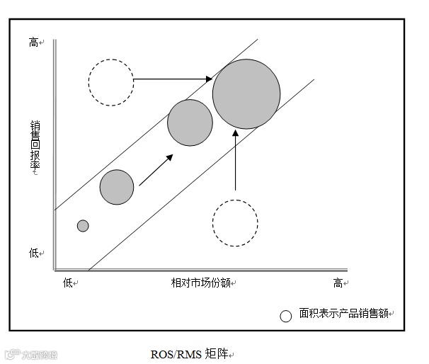 ROS/RMS(Return Of Sales/Relative Market Share)矩阵也称做销售回报和相对市场份额矩阵,主要是用来分析企业的不同业务单元或产品的发展战略。这个模型认为,企业某个业务单元或产品在市场上的销售额应该与其在市场中的相对份额成正比,并且该业务单元或产品的销售额越高,该业务单元或产品为企业所提供的销售回报就应该越高。