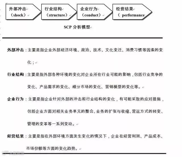 SCP(structure、conduct、performance)模型,分析在行业或者企业受到表面冲击时,可能的战略调整及行为变化。