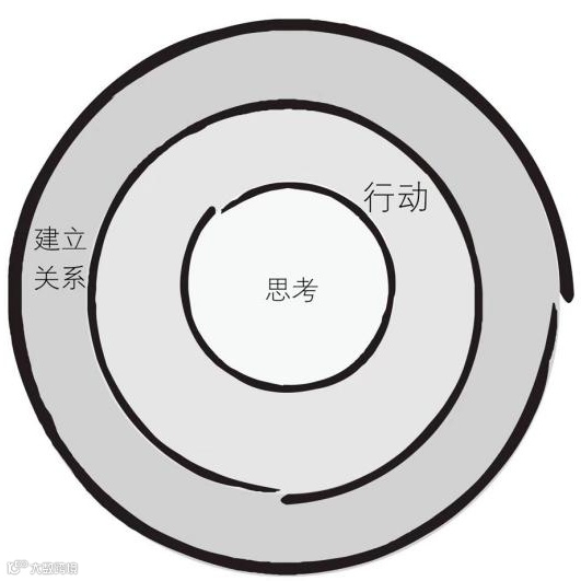 将这三个维度想象成一个同心圆。建立关系是同心圆最外面的那圈。位于同心圆中心的是思考圈,中间的是行动圈,行动圈囊括了思考圈。而最外面囊括了思考圈和行动圈的则是建立关系——人际维度(见下图)。