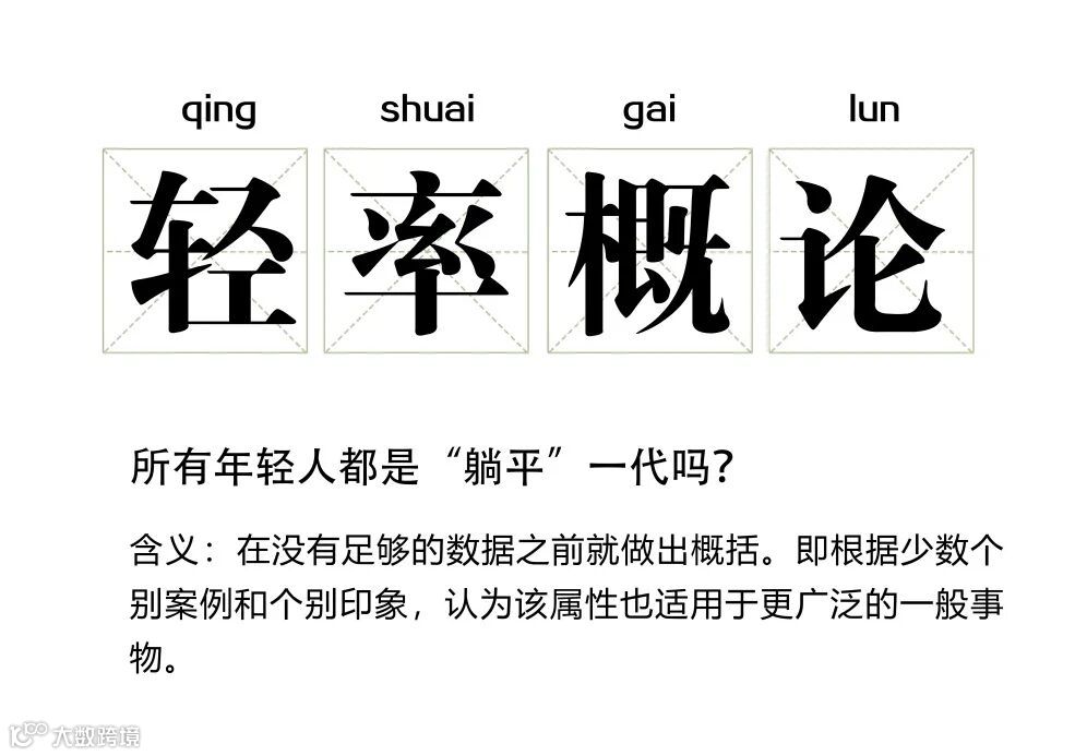 “男人都······”“女人都······”,通过身边极少数例子为群体贴标签,从而将个人的问题归结为群体的特征,就是犯了“轻率概括”的思维误区。