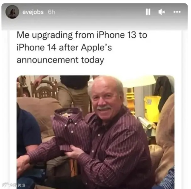 有这种想法的并不是任泽平一个人。iPhone14发布之后,乔布斯的女儿Eve Jobs也在社交平台上放出了一张图片,来表达自己的不认同。图片中,一位男子手持的新衬衫与身上穿的衬衣一模一样,以此来暗示iPhone 14相较于之前的机型几乎没有变化。