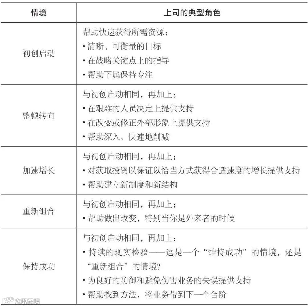 根据实际情境争取支持。你需要从上司那里获得的支持根据你的STARS情境组合的不同而不同,是初创启动、整顿转向、加速增长、重新组合、维持成功或者某种混合体。一旦你们达成了对于情境的一致认识,就要仔细思考你需要上司扮演的角色和你所需要的支持。在所有的五种情境中,你都需要上司给予你指导、支持和开展工作的空间。表4-2列出了你的上司在STARS的每一种情境中可能扮演的角色。